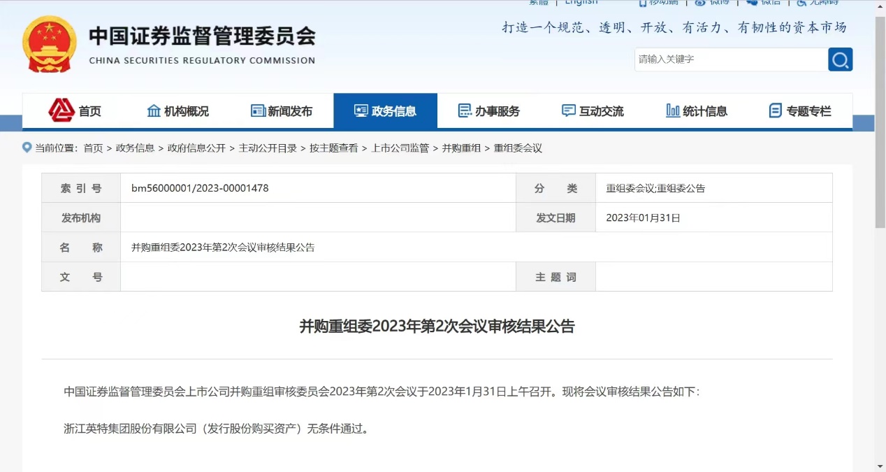 2023年1月31日,公司黨委書記、董事長應(yīng)徐頡帶領(lǐng)公司董事會(huì)秘書譚江、財(cái)務(wù)負(fù)責(zé)人金小波以及獨(dú)立財(cái)務(wù)顧問財(cái)通證券等中介機(jī)構(gòu)組成的答辯團(tuán)隊(duì),向中國證監(jiān)會(huì)并購重組審核委員會(huì)就公司重大資產(chǎn)重組事項(xiàng)進(jìn)行了匯報(bào)和問題答辯,經(jīng)其審核,我司重大資產(chǎn)重組項(xiàng)目獲得無條件通過。