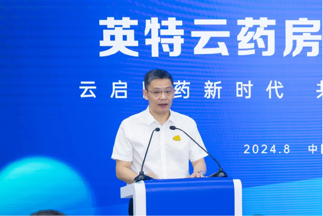 汪洋作“英特云藥房”項目介紹。領(lǐng)導嘉賓共同為“英特云藥房”項目啟動儀式按下啟動鍵,點亮醫(yī)藥服務(wù)的智慧駕駛艙。